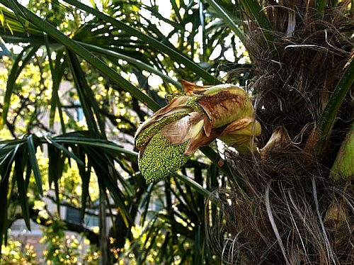 めぼしい被写体を探していたら、堤防に植えられた棕櫚の木が花を着けていました。